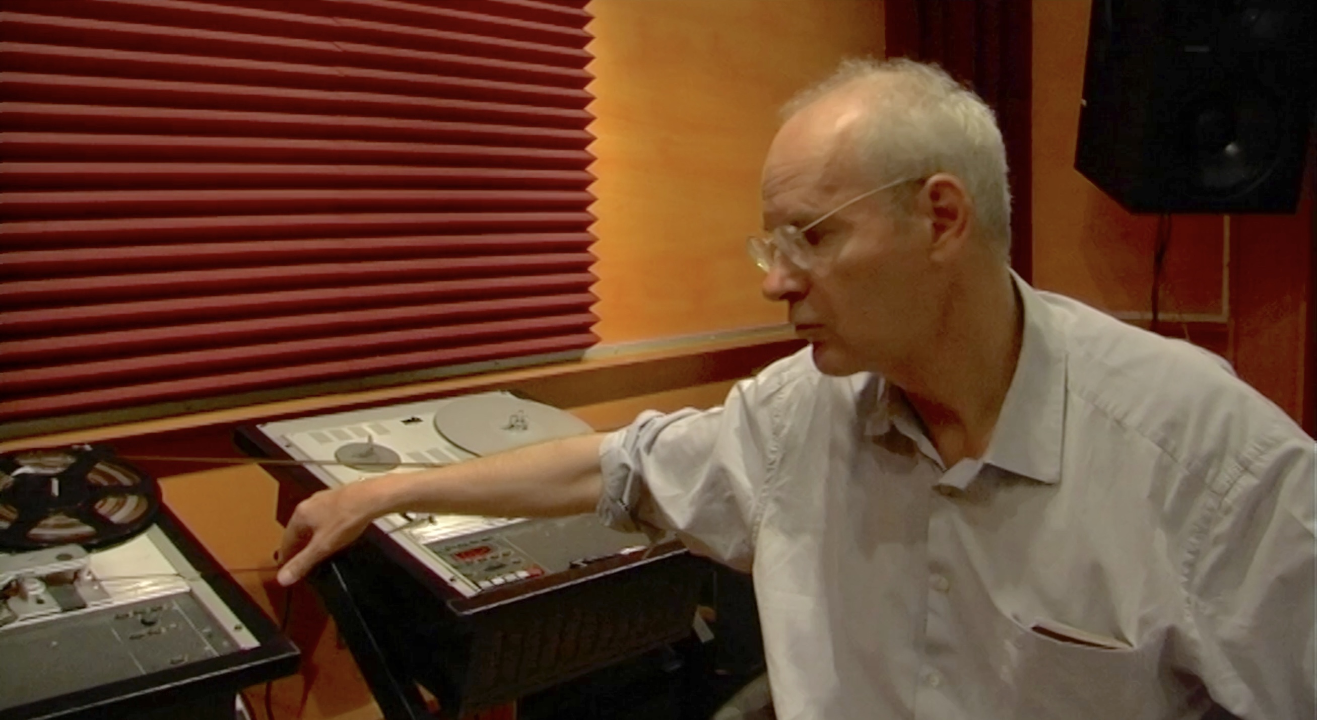 Cette image est tirée d'une vidéo tournée en 2012 par Rodrio Maia Sacic, à qui je montrais les techniques personnelles que j'emploie en studio avec les magnétophones à bande ; ici, j'illustre concrètement un des exemples de défilement contrarié, comme je l'appelle, décrit plus loin en IV/e ….. Dans cette démonstration, une bande magnétique défile à partir du magnétophone 1, passe sur la tête de lecture de ce magnétophone, avant de repasser sur les têtes du magnétophone 2 à sa droite (de sorte que le même son est lu deux fois avec un décalage de temps variable, pour un effet de canon) et de se réembobiner sur le magnéto 1 (il faut bien sûr un appareil enregistreur supplémentaire, qu'il s'agisse d'un magnétophone à bande libre ou numérique, d'un enregistreur DAT, d'un graveur de CD, etc...). Il est alors possible d'influer avec sa main sur le déroulement de la bande devant les têtes du magnéto 2 – un effet largement utilisé par moi dans mes Vingt-quatre préludes à la vie (voir le blog du 8 janvier 2023). Ce tournage a eu lieu au studio 116C du Groupe de Recherches Musicales, où je travaillais à ma Deuxième symphonie (voir L'Histoire de mes musiques concrètes, du 19 février 2023), et, je ne le savais pas encore, c'était la dernière fois que je composais – avec quel plaisir - dans un studio professionnel.